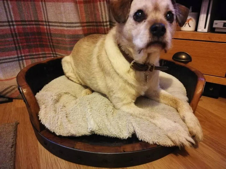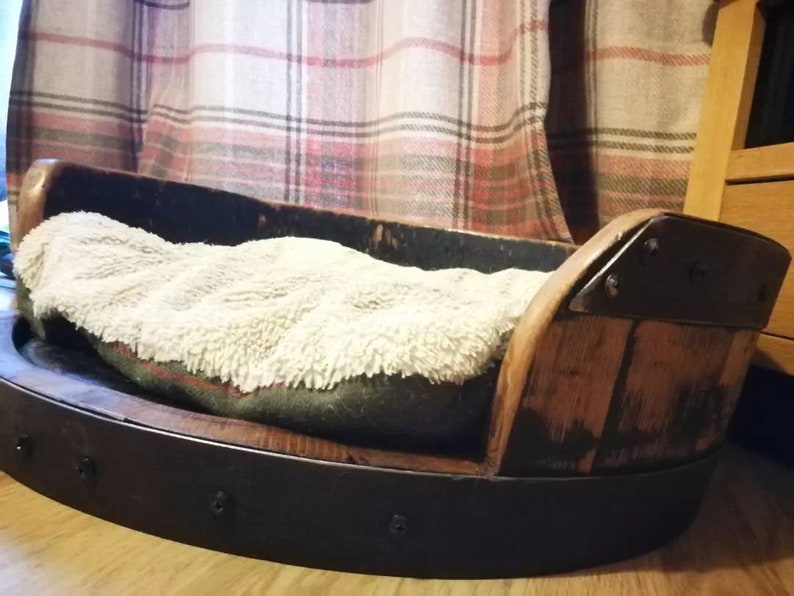 Introducing the perfect blend of rustic charm and comfort for your beloved pet: our handmade dog bed crafted from authentic whisky barrel heads. This unique piece is tailored for dogs that chow down on life with enthusiasm.