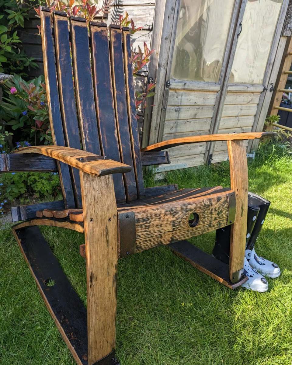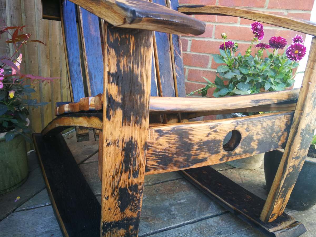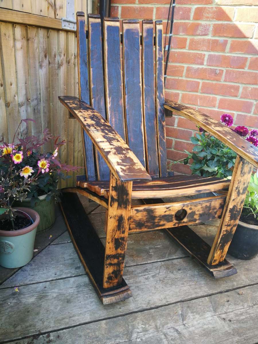 Introducing our unique rocking chair, expertly crafted from authentic whisky barrel oak. This remarkable piece combines rustic charm with modern functionality, making it a standout addition to your outdoor space.