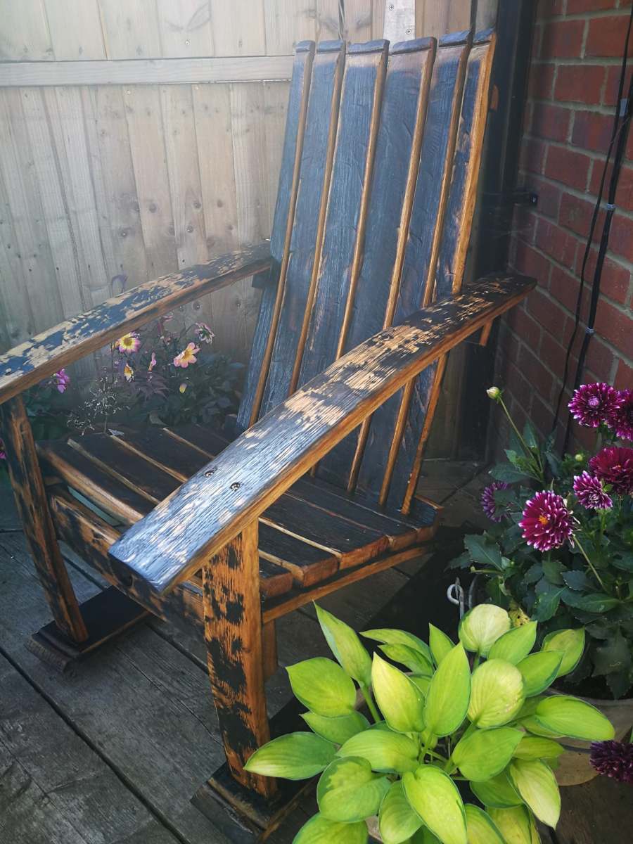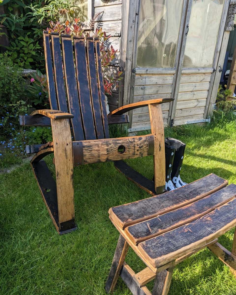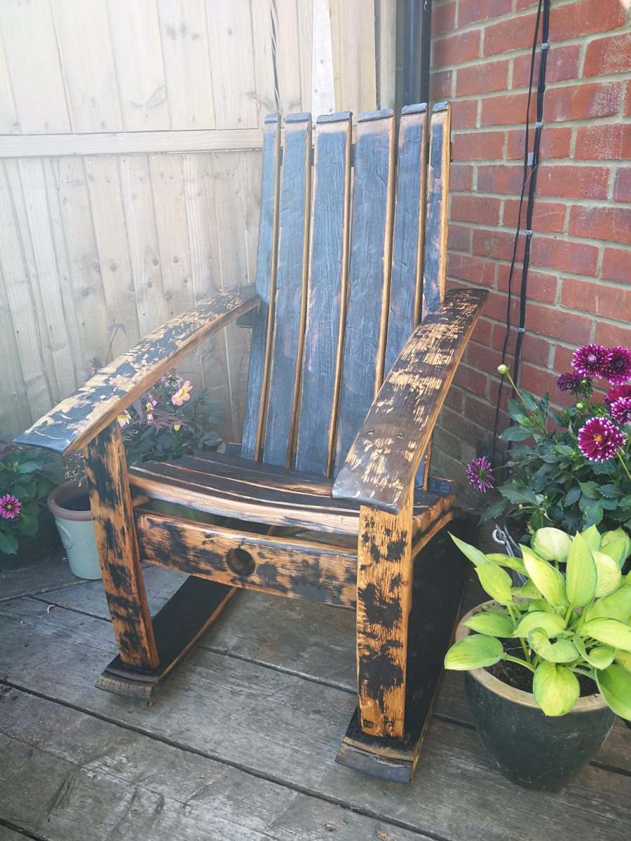 Introducing our unique rocking chair, expertly crafted from authentic whisky barrel oak. This remarkable piece combines rustic charm with modern functionality, making it a standout addition to your outdoor space.