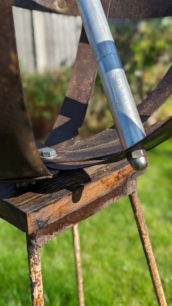 Metal Stand: Once a plant stand, this base retains its original shabby paint pattern, giving the orb a vintage appeal.